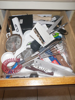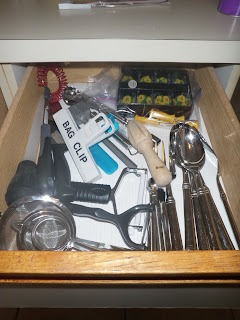 This is the drawer right next to the cutlery. It holds larger serving ware and lots of other miscellaneous stuff. One challenge I had was to incorporate the stuff from the cutlery drawer that I took out yesterday! I also found a ridiculous number of chopsticks from PF Changs to Asian Station, our decent Chineese/Japaneese delivery! I opted to put the chopsticks in Isa’s arts and crafts bin since I don’t see us using 15 sets of chopsticks in the near future!