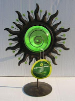 Description: The sun-shaped candle holder is glass and metal, and was sold in four colors (red, green, blue, and yellow). “15.75” Candle Holder” is printed on the product’s hang tag.