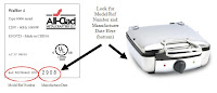 Description: The recalled All-Clad 4-Square Belgian Waffle Maker is electric with a stainless steel exterior. The recall involves units with a model/ref number of #WD700462 and 4-digit manufacture date codes ending in “08”. The model/ref number and manufacture date code are located on a white label on the bottom of the waffle maker.