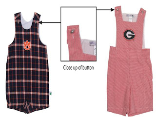 Description: This recall involves Infant and Toddler Gingham and Flannel Shortalls, which are overalls with short pant legs. They have a collegiate appliqué or embroidery on the front. Sizes included in the recall are 6/9 month, 12 month, 18 month, 2T, 3T, & 4T.