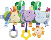 Description: This recall involves the Taggies(tm) Strollin’ Along stroller activity bars. The multicolored, fabric, and plastic activity bars feature a yellow giraffe, a purple hippo and a blue elephant attached to a 12″ long elliptical base with straps that attach to a stroller. The Taggies(tm) and Earlyears(r) logos are located on woven and satin labels sewn into the seam on the lower left front of the activity bar.