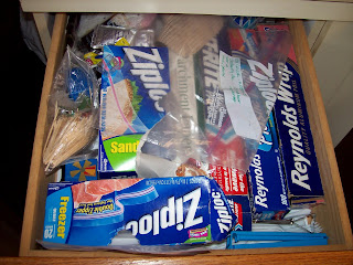 I was thinking of skipping Tackle It Tuesday today, up until I went to heat up my lunch. I needed some saran wrap and opened the drawer and this is the crazy mess I found!
